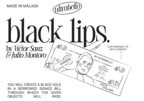 Black Lipsturns a simple black sticker into a real, physical black hole. A borrowed and signed bill receives a round black sticker… and that sticker becomes a Black Hole through which objects can genuinely pass.