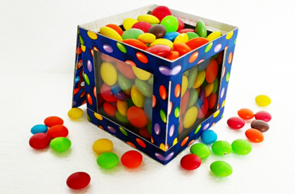 You open the transparent box and can, if you wish, hand out or shake out the candies, the box is now also printed with a candy print!